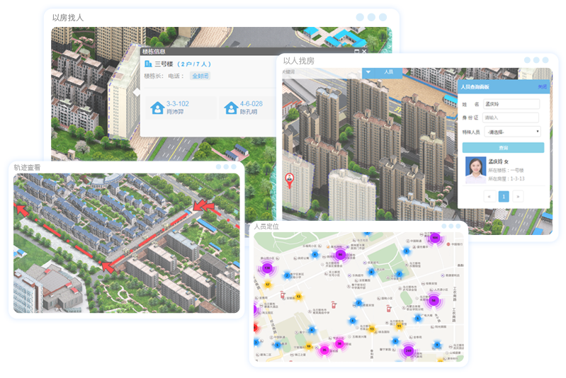 通过平面地图、仿真三维地图,实现事件定位、人员实时定位、网格员签到、轨迹查看、以人找房、以房找人、基础设施、快速查询等功能。
