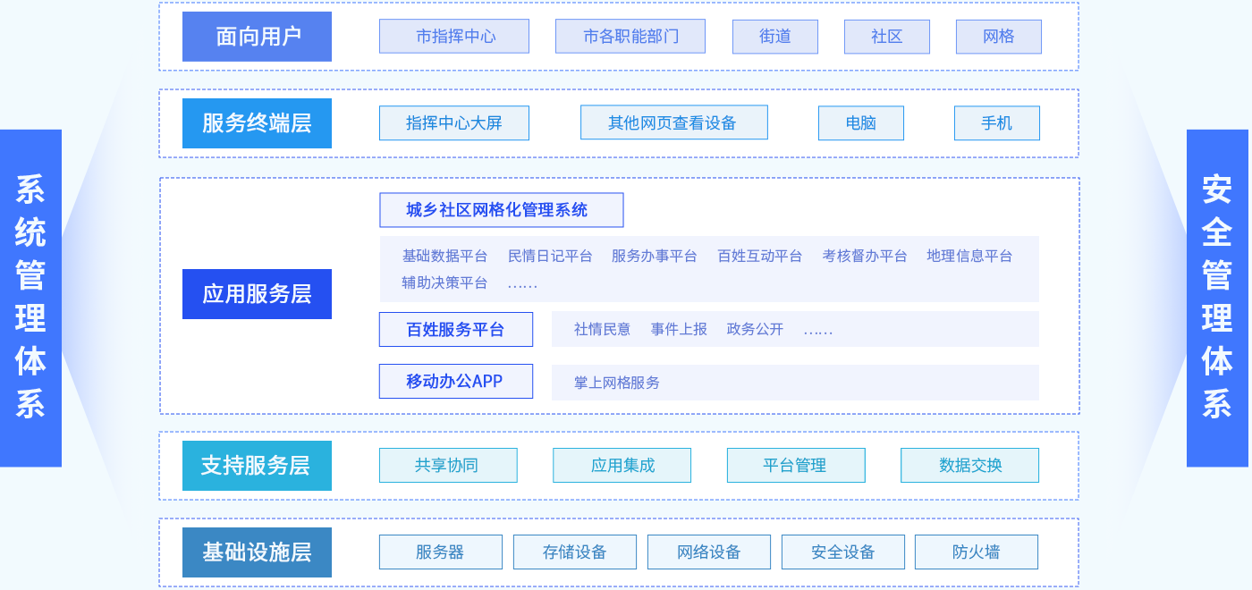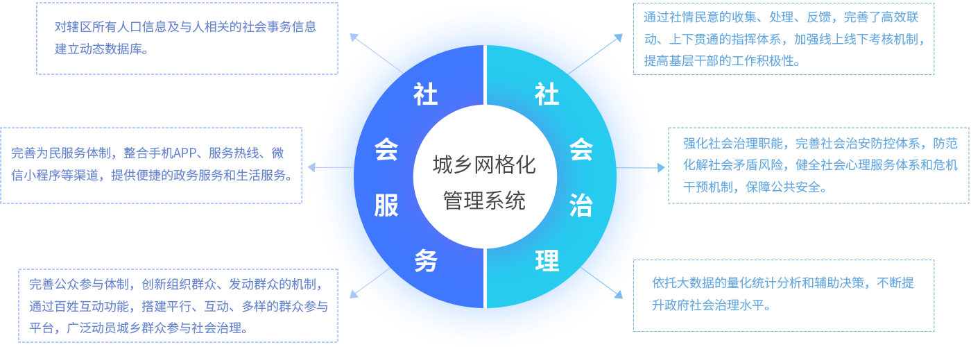 系统主要包括基础数据、服务办事、考核督办、地理信息、指挥中心、大数据统计分析、民情日记、系统管理等功能模块,配套建设的还有手持终端APP、微信。社区网格员以网格为依托,充分利用辖区资源,变被动管理为主动服务。集中收集居民诉求,反映居民所需所想;及时妥善解决问题,满足居民各种服务需求,对掌握的事件信息及时通过网格平台进行反馈,实现"大事不出街道,小事不出社区"。