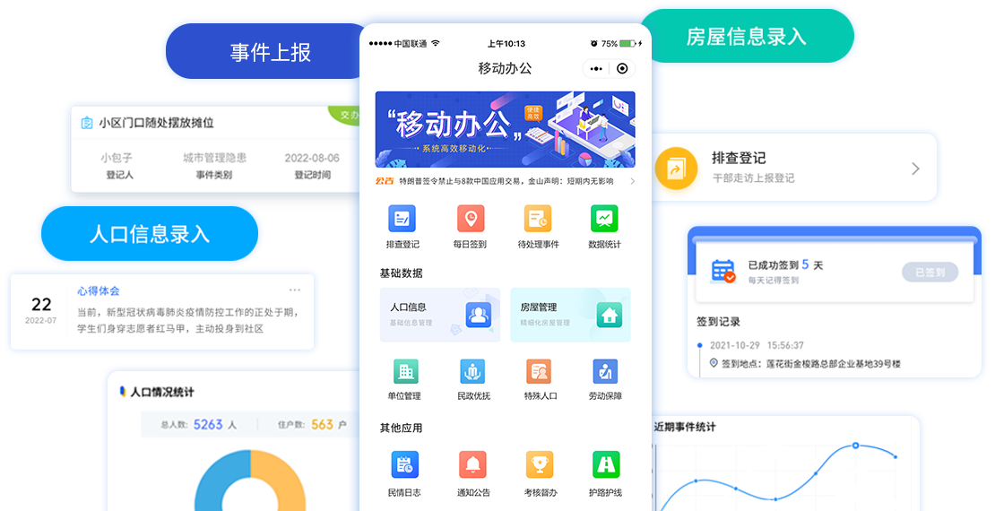 网格管理人员利用智能手机进行"每日签到、事件排查上报,解决待处理事件,书写日志,查看人口数据、更新辖区基础信息"等相关内容的操作。